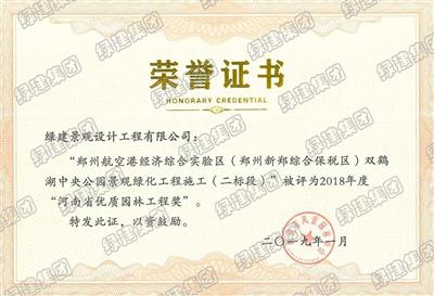 雙鶴湖二標(biāo)榮獲2018年度河南省優(yōu)質(zhì)園林工程獎(jiǎng)