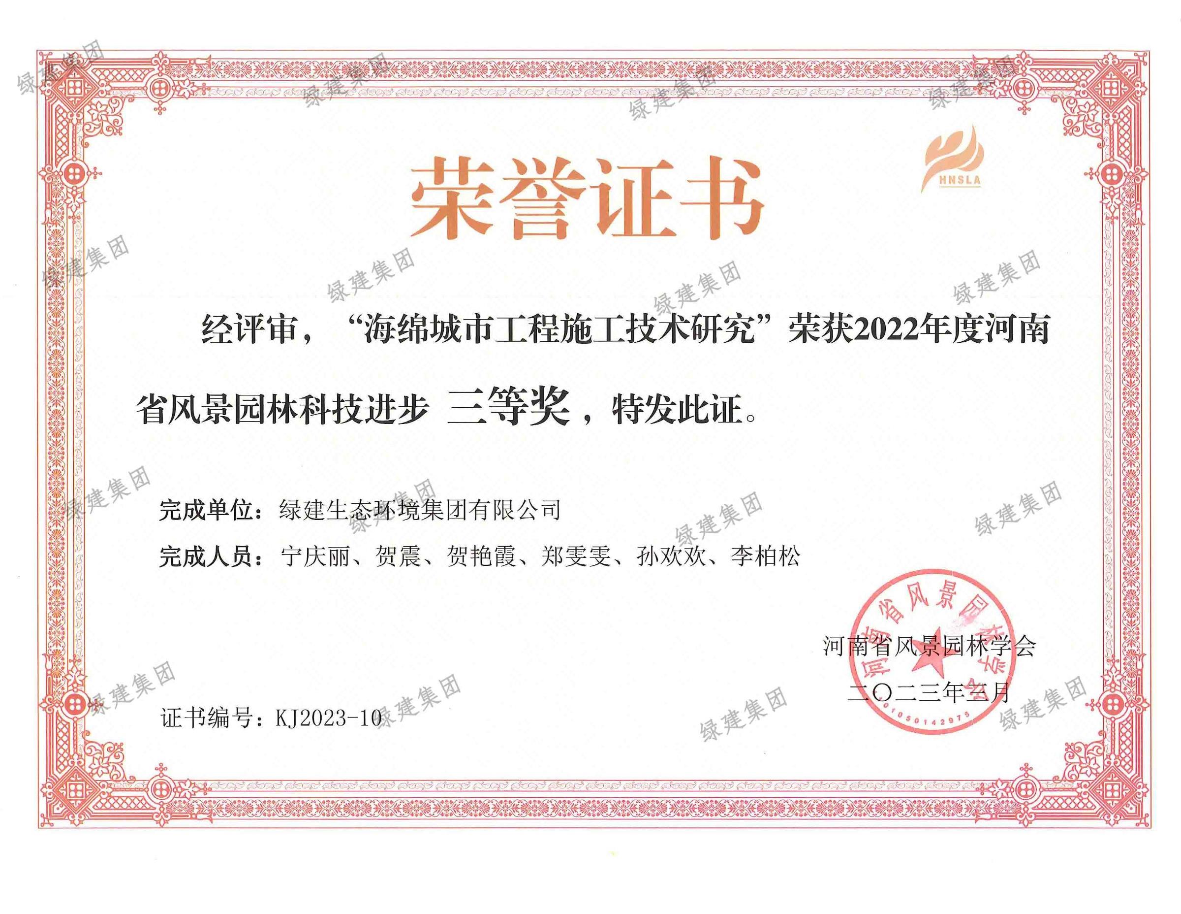 22年度海綿城市工程施工技術(shù)研究科技進步獎三等獎